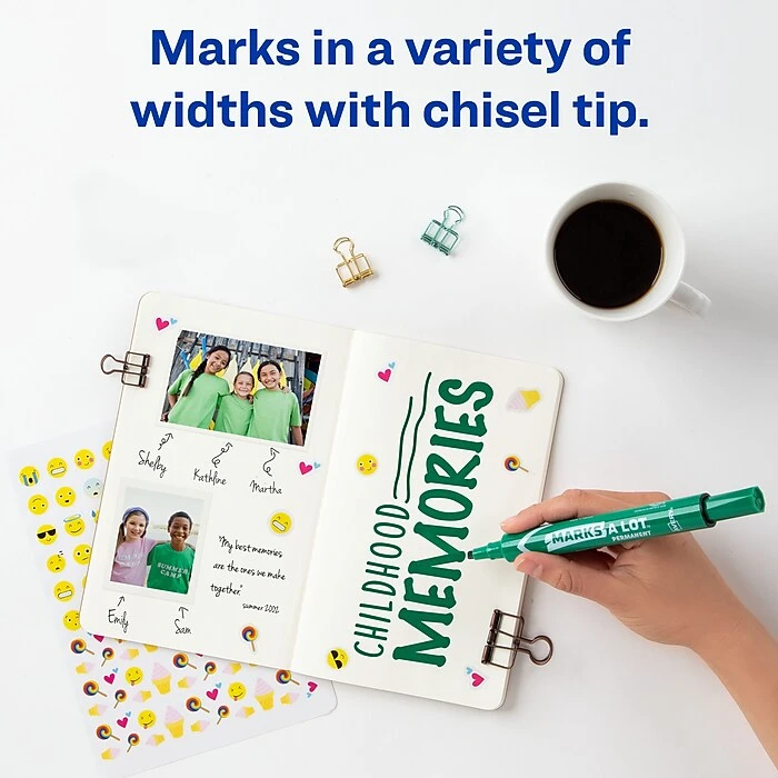 Make your mark on the world with Avery Marks-A-Lot permanent markers. These large, thick markers hold over 30% more ink than regular desk-style markers. The resilient chisel tip stays solid even with frequent use and is great for creating various different line widths. The versatile, green permanent marker ink dries quickly when used but wonโt dry out if you forget the cap. Leave the cap off for up to half an hour and you will still be able to pick the marker back up and keep writing. The permanent ink resists wear and water exposure and is perfect for any use. These markers work with multiple surfaces including paper, cardboard, metal, PVC, concrete, plastic and ceramic. Write on sports equipment, make signs for yard sales, mark boxes and more. Marks-A-Lot chisel tip markers are great everywhere from classrooms and offices to warehouses and manufacturing facilities. Avery Marks-A-Lot permanent markers are also low-odor and nontoxic so that they can be safe in classrooms as well as in laboratories. The ink is ACMI certified as nontoxic and conforms to ASTM D4236.