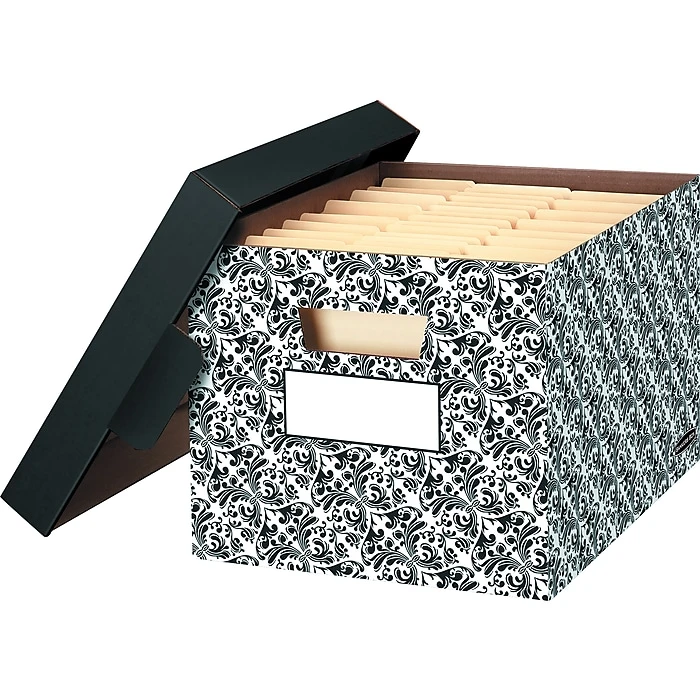 Stylish, colorful, and strong for a variety of applications. A deep, locking lift-off lid stays in place for secure file storage. FastFold quick and easy assembly. Double-end, single-side, and double-bottom construction for moderate stacking or for use with shelving.