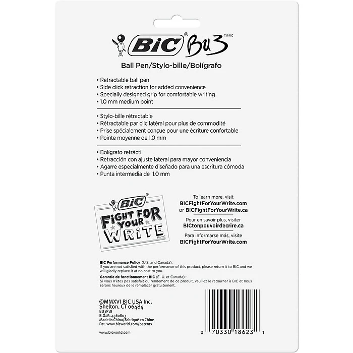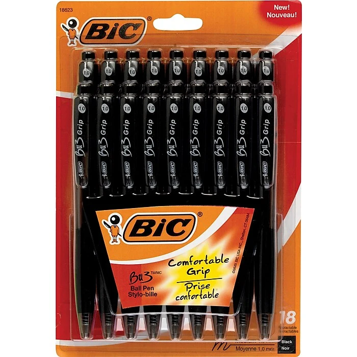 BIC BU3 retractable medium-point black ballpoint pens provide a professional look and feel to your office and desks. The black, translucent barrels create a sleek appearance, while the retractable points keep stray marks at bay. The medium point and black ink allow for concise lines that stand out against the page versus fine-point pens. Bulk packaging gives you control over the inventory of your stockroom while also reducing ordering costs versus smaller packs or individual pens.