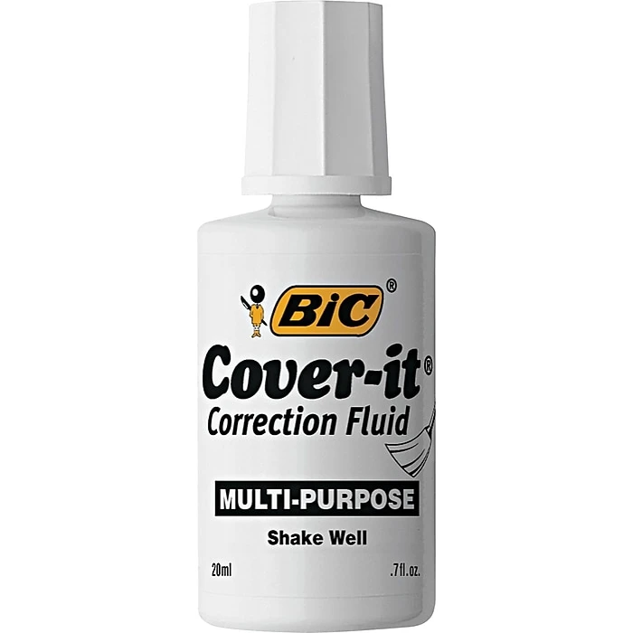 This BIC Cover-It correction fluid is fast drying and perfect for correcting faxes and copies. It offers extra coverage for smooth, one-time applications. This multi-purpose fluid corrects pen ink, faxes, copies and more.