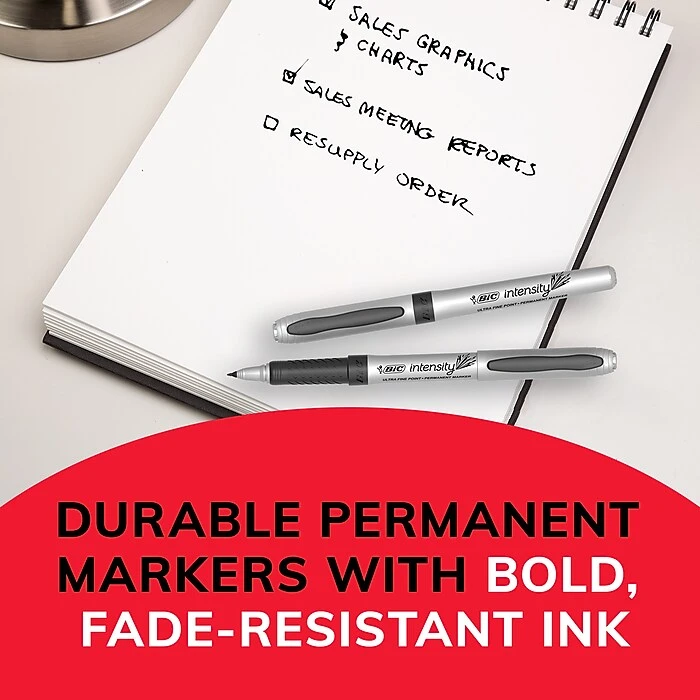 BIC Intensity Permanent Marker is a durable permanent marker with bold, long-lasting color. Each marker features a unique snap cap with a vapor seal locking mechanism to help prevent dry-out. Ideal for labeling, arts and crafts, adult coloring, and more, each marker features a soft, non-slip grip that offers comfort and enhanced control, while the durable fine point creates precise marks that stand out. Capable of marking on a wide variety of surfaces, this low-odor, non-toxic marker has acid free* ink and comes in a vivid assortment of fashion colors, making it a great choice for use at home, school, or the office. Made in the USA of US and foreign parts. *No added acid; no measurable pH.