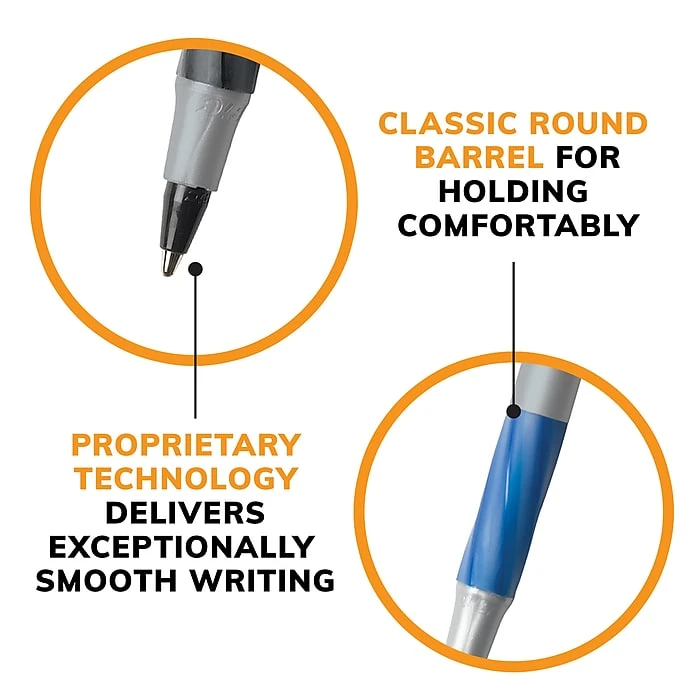 - Pack of 36 pens with 24 black ink pens and 12 blue ink pens per pack