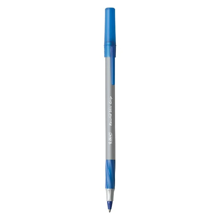 Write drafts, journal entries, and other papers with these fine-point pens. With an included protective cap, these pens help keep the ink from drying out for dependable, long-lasting use, while the groove-fingered grip lets you hold the pen comfortably. These BIC Round Stic Grip Xtra Comfort blue ballpoint pens have smooth-flowing blue ink, producing clear, precise lines for enhanced legibility.