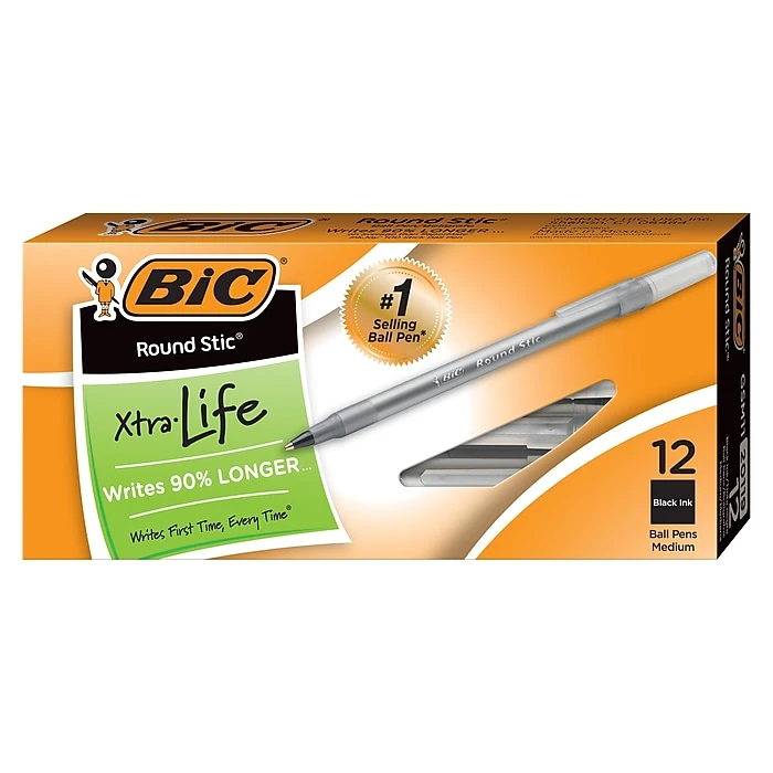 - One 12-count pack of BIC Round Stic Xtra Life Black Ballpoint Pens