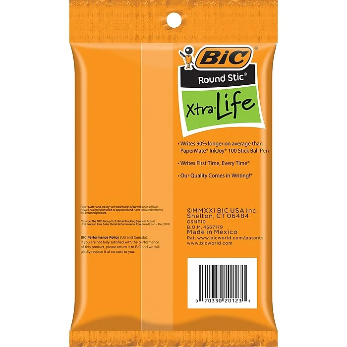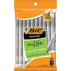 Stock up your pen supplies with these BIC Round Stic ballpoint pens. The round shape provides a comfortable grip, while the cap and clip prevent them from rolling, ensuring that they stay where you leave them. These BIC Round Stic Xtra Life ballpoint pens are made with a compact design and come in a pack of 10, making it easy to keep your home or office stocked.