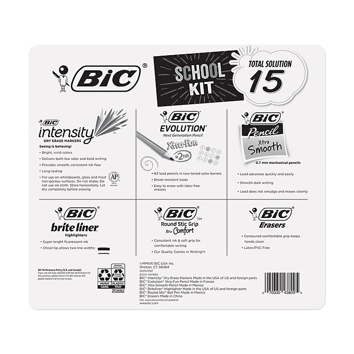 - Kit includes three Xtra Smooth mechanical pencils; three yellow Brite Liner chisel-tip highlighters that deliver bright and fluorescent broad and fine lines; three Intensity dry-erase fine-point markers in black, blue, and red; two BIC Round Stic ballpoint pens in black and blue for smooth and reliable writing