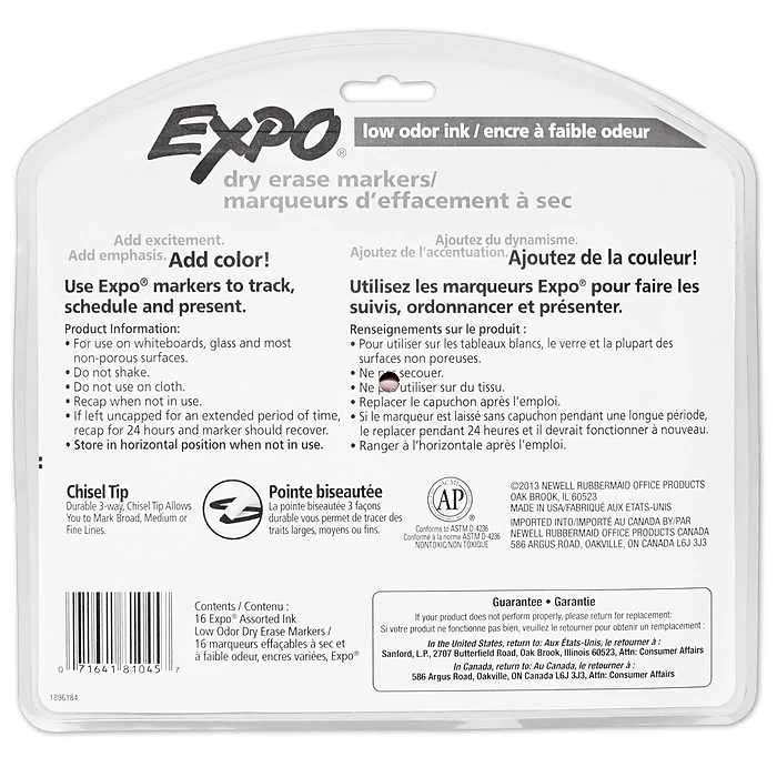 Bright, vivid, non-toxic ink is quick-drying, smear-proof, easy to see from a distance, and provides consistent color quality. Whiteboard markers with versatile chisel tips allow for broad or fine writing. Erases cleanly and easily with a dry cloth or Expo eraser. Ink is specially formulated to be low-odor. Perfect for use in classrooms, small offices, and homes. Made in the USA Expo 2 Low-Odor Dry Erase Markers, Chisel Tip, 16-Pack, Assorted Colors.