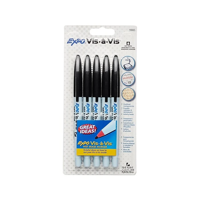 Produce clean text and detailed drawings on non-porous surfaces with these wet-erase markers. The advanced black ink creates bold marks on transparencies and stands up to the heat of overhead projectors without bubbling or fading. Smooth barrels help improve control, and fine tips let these Expo Vis-a-Vis wet-erase markers create sharp lines that are easy to wipe away with a damp cloth.