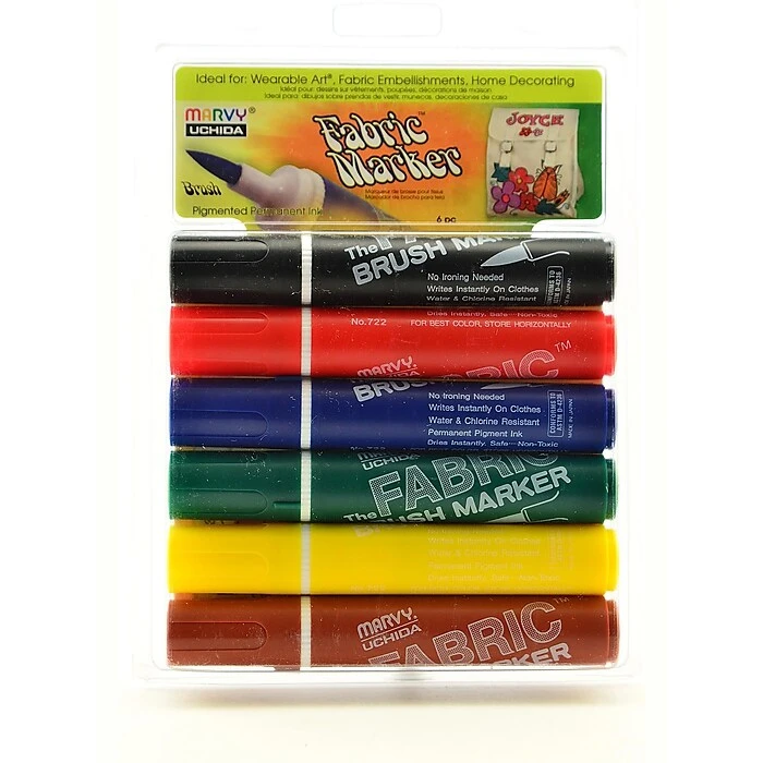 These markers will mark, write or draw on any fabric. No pre-washing is needed. They dry instantly and are permanent and weatherproof. No ironing or steaming is needed. The colors will not stiffen and markers are non-toxic. Fade resistant, even in pools. Machine washable and dry cleanable. Primary set contains black, red, green, blue, yellow and brown. Pastel set contains orange, fluorescent violet, pale green, cool gray, flesh and crimson lake. Fluorescent set contains yellow, orange, pink, blue, violet and green.