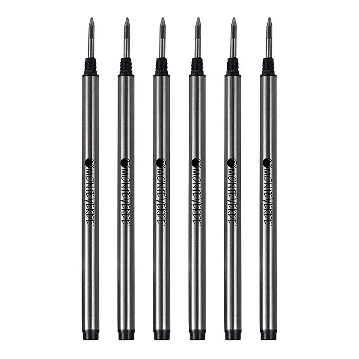 Monteverde® Roller ball refill in blue/black for Montblanc® roller ball pens features metal parts with high quality and fine formulated inks for uninterrupted writing. Refill bears a nickel plated brass tube and a fine Swiss tip, sold as 6 per pack.