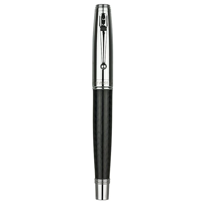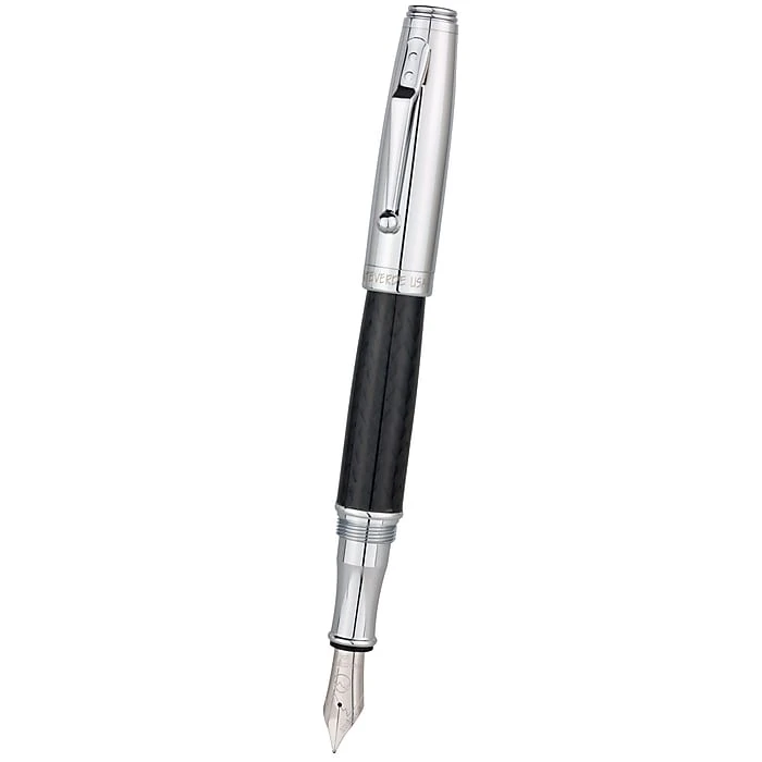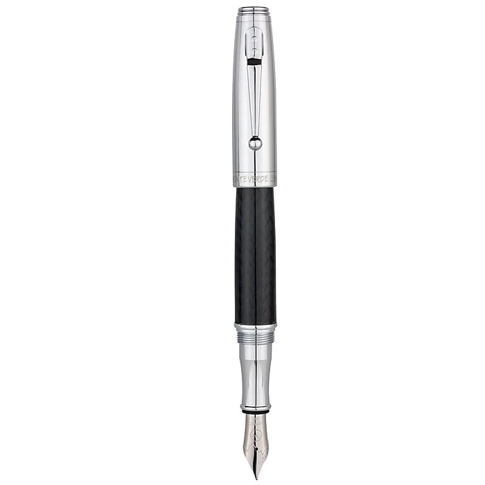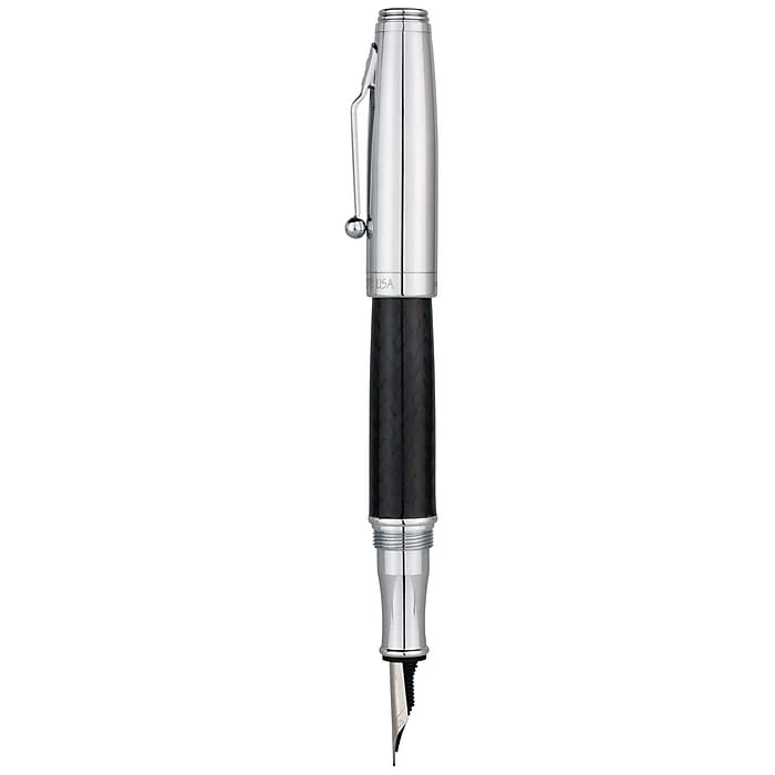 Monteverde® Invincia™ Chrome fountain pen comes with stub nib and features postable screw type cap. Pen has a dimension of 7.1″ x 2.8″ x 1.1″ and has black carbon fiber barrel and chrome cap with mirror chrome clip and trims.