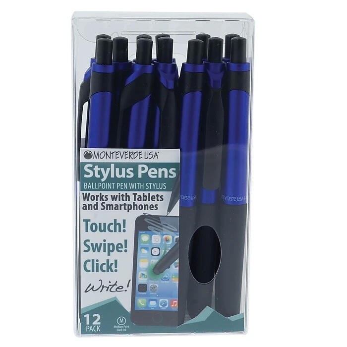 Monteverde® S-106 Click action one touch blue ballpoint pen has stylus at the tip which blends easily with the black barrel for a smooth look. Pen with a dimension of 5.5″ x 0.5″ x 0.5″ weighs 0.8 oz and is sold as 12 per pack.