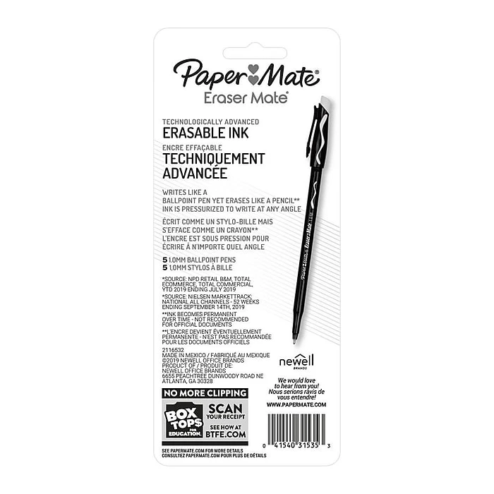 Write at any angle with the Paper Mate Erasermate Pen, which features pressurized ink. The erasable pens in this pack of five are topped with erasers to rub away the blue ink.