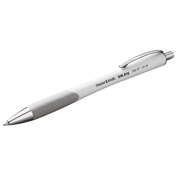Draw, write or simply doodle with these medium-point retractable ballpoint pens. The white barrel and silver accents give these pens a sleek, stylish appearance, while the vivid blue ink gets writing noticed without smudging or smearing. These Paper Mate InkJoy 700RT medium-point ballpoint retractable pens feature a textured grip to make extended writing sessions more comfortable while providing enhanced control.