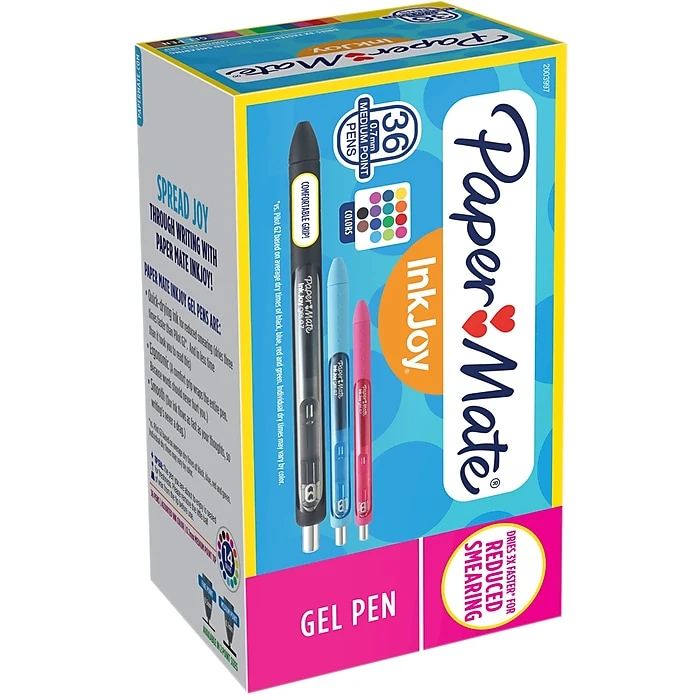 Paper Mate InkJoy medium-point gel fashion pens create vivid colors with ink that dries quickly to prevent smearing. A fully wrapped comfort grip makes it easier to write by reducing hand fatigue, while smooth-flowing gel ink keeps the words flowing onto the page.