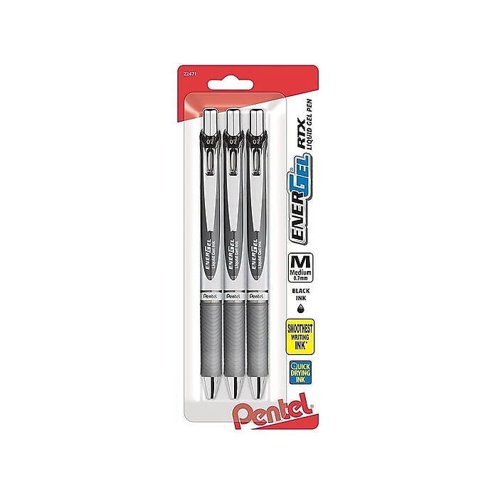 Write with smooth, thick lines using these black Pentel EnerGel RTX retractable gel ink pens. The ink flows consistently from tip to paper and resists both water and fading. These Pentel EnerGel RTX retractable gel ink pens are designed with a sleek, sophisticated appearance and are sold in packs of three, so you’re never caught without a spare.