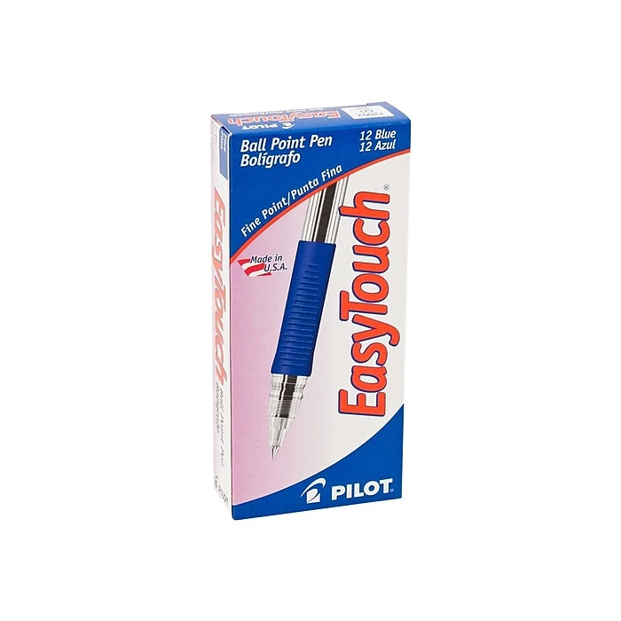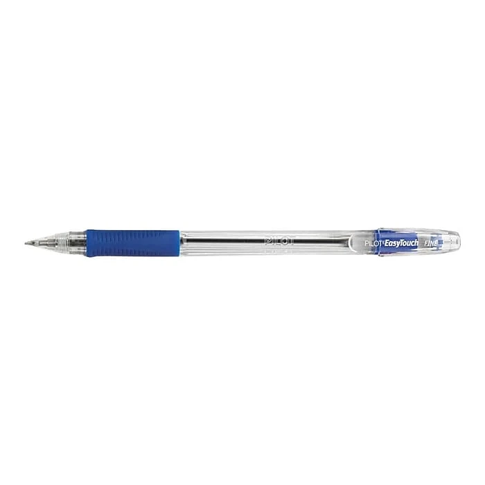 Write for extended periods of time comfortably with these fine-point blue pens. Designed with a smear-resistant ink formula, these pens keep your essays, journal entries, and other written works crisp and clean. These Pilot EasyTouch blue ballpoint pens have a form-fitting rubberized grip for increased writing comfort and feature a clear barrel, so keeping tabs on your ink supply is easy.