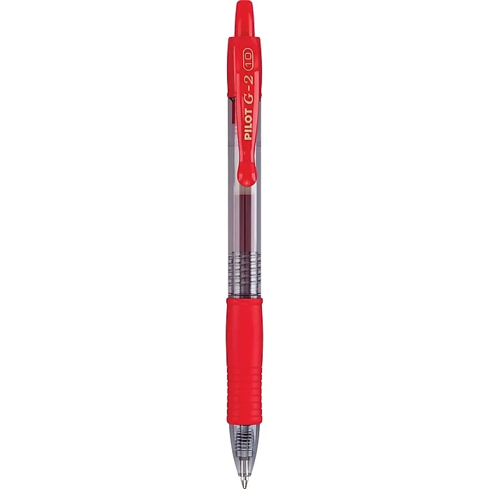 Enjoy free-flowing, comfortable writing by using these retractable gel roller pens. Featuring a 1.0mm bold-point tip, these pens produce bold, smooth lines, while the eye-grabbing red ink keeps notes front and center. These Pilot G2 bold-point premium gel roller pens have a round, see-through barrel design, preventing you from unexpectedly running out of ink.