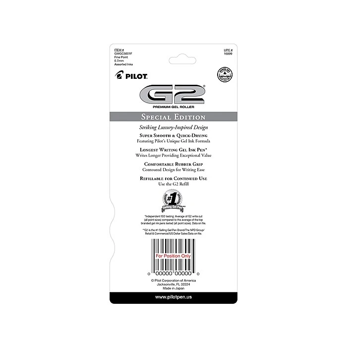 Enjoy a premium, ultrasmooth writing experience with the Pilot G2 Special Edition gel pens. The perfect writing tools for personal and professional use with smooth-writing, quick-drying gel ink perfect for everything from jotting notes to penning a novel, and everything in between. The G2 Special Edition pens combine everything you love about G2 with a sophisticated metallic ombre barrel, glossy black accents, and unique metallic color-coordinated clip imprint, making them the perfect companions for lengthy writing tasks.