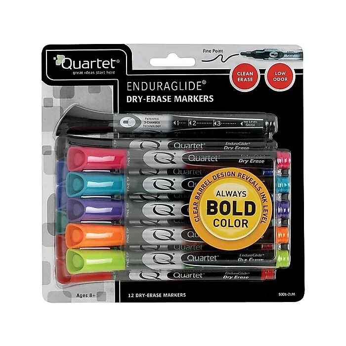 Make your point clear by writing it in one of the vibrant colors of these Quartet EnduraGlide fine-tip dry-erase markers. Nontoxic and low-odor, these markers deliver a constant ink flow that lets them glide easily across whiteboards and other nonporous surfaces. These Quartet EnduraGlide fine-tip dry-erase markers come with roll-resistant caps so they stay in place on the board tray.
