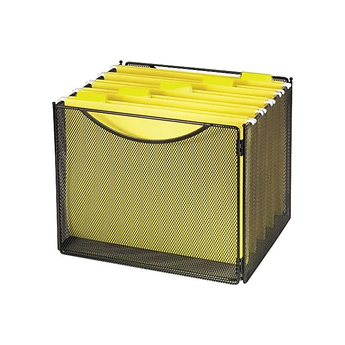 The Safco Onyx Mesh Desktop Box File measures 10 H x 12-1/2 W x 11 D and have open top for letter size hanging files