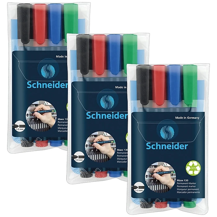 The Schneider Maxx 130 is a permanent marker for writing on almost all types of materials. It has a low odor and is free of toluol and xylol. The bullet tip writes in two line widths, 1 & 3 mm. With its quick-drying, waterproof, and highly light-resistant format, the Maxx 130 will not dry out, even if the cap is left off for 2-3 days. The Schneider Maxx 130 has a practical clip cap and can be refilled using Maxx 640 refill station. Housing made of 95% recycled plastic and made in Germany. Each pack includes 4 markers of assorted ink colors: Black, Red, Blue and Green. Sold as 3 packs for a total of 12 markers.