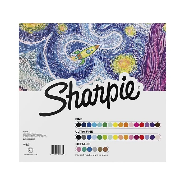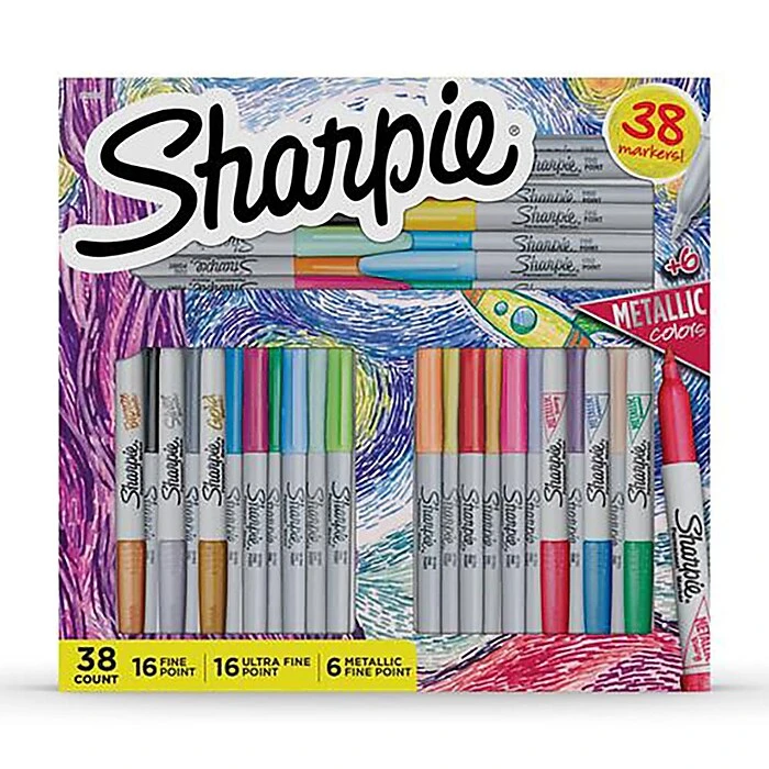 Dare to unleash the ultimate in creativity with this set of 38 Sharpie permanent markers. Choose from a wide range of colors, including Sharpie metallic markers for a lustrous sheen that stands out on light or dark surfaces. Featuring markers with bold fine points built for jaw-dropping marks and incredibly sharp ultra-fine points for ridiculous detail, it’s a gift set that inspires creativity.