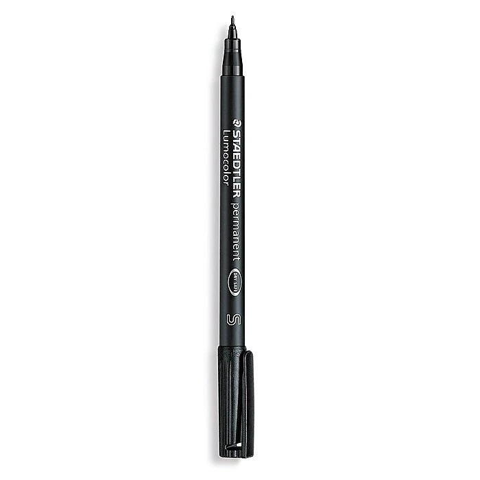 Quick drying permanent inks won’t bead or smudge. Available in black with a superfine (0.4mm) tip, this pen marker writes on overhead transparency film or glossy surfaces such as photos, transparency sleeves, slide frames, cromalins, glass, acrylic, and vinyl. Sold as a pack of 10 pen markers.