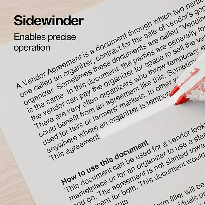 Complete your collection of essential desk items with these sidewinder correction tapes. The white-out tape rolls out smoothly and cleanly, leaving no shadows to help you retain the quality of your documents. An optimized fast-dry formulation lets you correct multiple typos quickly, while the sidewinding design enables precise revisions. These Staples sidewinder correction tapes have a compact dispenser for hassle-free use and simple storage.