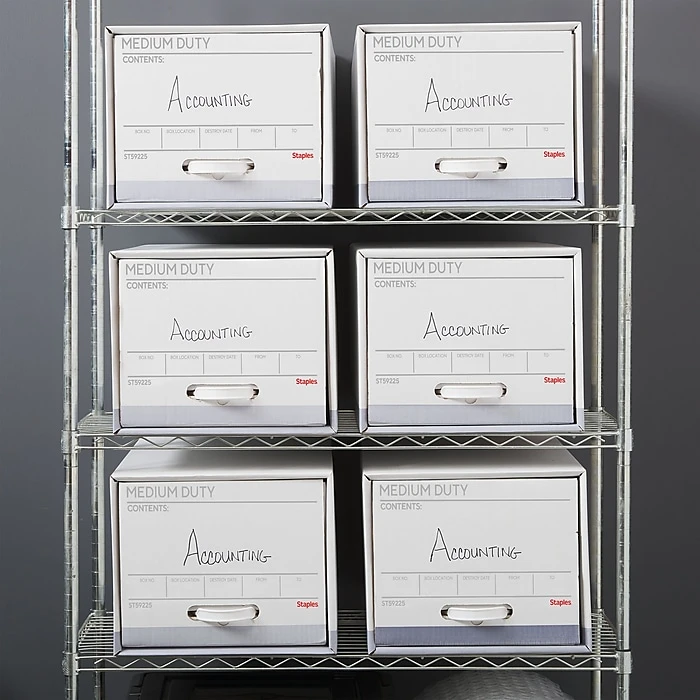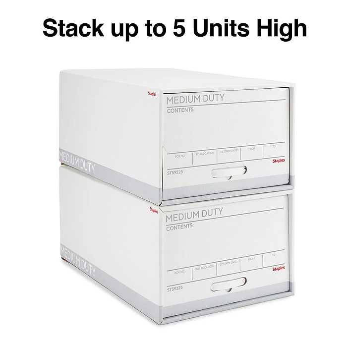 Eliminate clutter from your desk with these storage drawers. The steel support frame and medium-duty construction offer durability, while the plastic handles and drawer-style design provide easy access to stored files. A preprinted write-in area enables hassle-free labeling for quick identification. These Staples medium-duty corrugated storage drawers are stackable to save space in your records room.