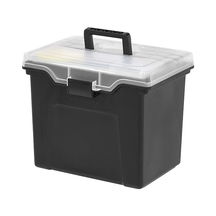 Bring files with you on business trips by using this black file box. The organizer top has a clear lid for easy identification and lots of compartments to store supplies and accessories, while the molded plastic handle offers convenient portability. This Staples portable black file box with organizer top is made of durable polypropylene to keep contents safe from spills and damage.