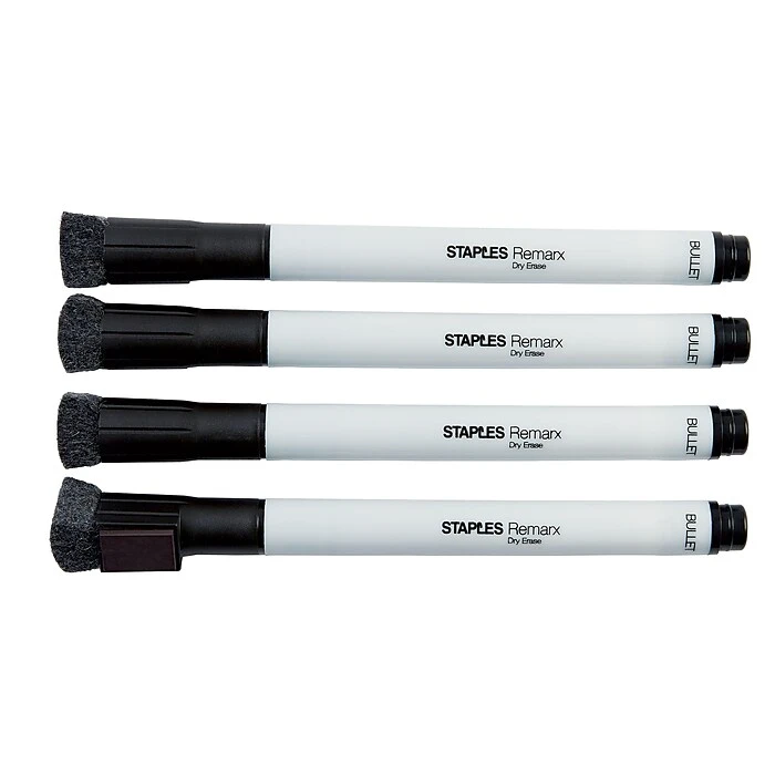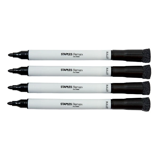 Write on the whiteboard and wipe it clean with these Staples Remarx black magnetic dry-erase markers. They have a bullet tip that lets you create thin or thick marks proportional to the amount of pressure applied. These Staples Remarx black dry-erase markers each have a magnet attached to the back, ensuring the handy pens stay where you leave them.
