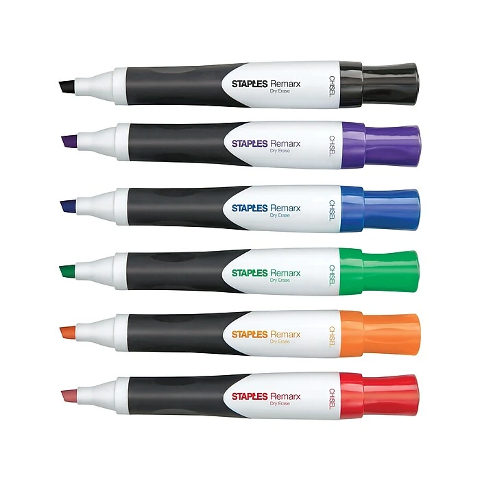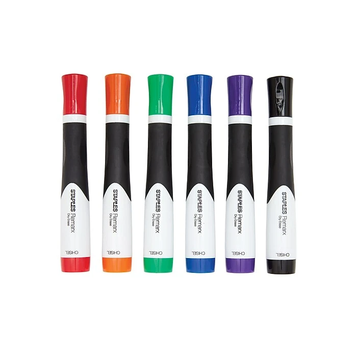 Use Staples Remarx grip tank dry-erase markers to create colorful messages on whiteboards and glass. Each marker in this 6-pack features a rubberized comfort grip to keep your fingers relaxed while you write. These markers write vividly but wipe away cleanly, and the chisel tips let you vary line sizes to catch attention. The low-odor, nontoxic formulation makes these Staples Remarx grip tank dry-erase markers ideal for use during long meetings or classroom sessions.