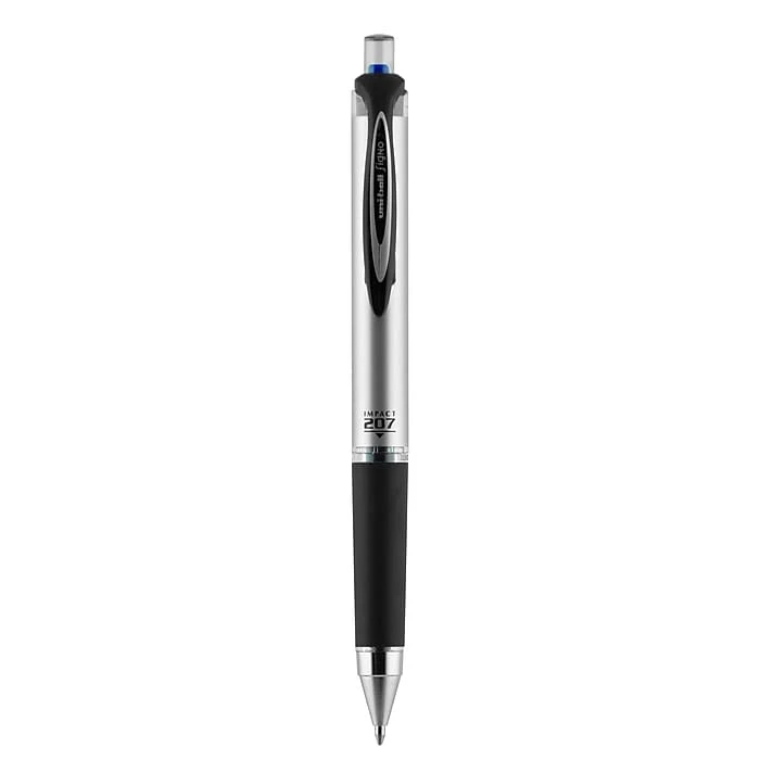 Make an impact with 207 IMPACT RT Gel Pens from uniball featuring a 1.0mm bold point with a stainless steel tip that resists bending and breaking. Even-flowing, pigment-based gel ink renders an outstanding ink laydown for a smooth writing experience and strikingly bold lines. Use these retractable gel pens for everyday writing tasks, check signing and all of your important signatures, trusting its quick-drying uni Super Ink. Exclusive uni Super Ink technology entrenches the gel ink deep into the paper, preventing document alteration, water damage or fading. The 1.0mm point delivers bold writing with a silky finish. A soft rubber grip helps you continue writing without fatigue while maintaining precision and detail throughout your tasks – and when your writing is complete, the innovative clip auto retracts the tip, protecting against unwanted gel ink marks and stains. Lend a vivid touch to your writing with these sophisticated retractable gel pens that glide smoothly for distinct and neat writing.