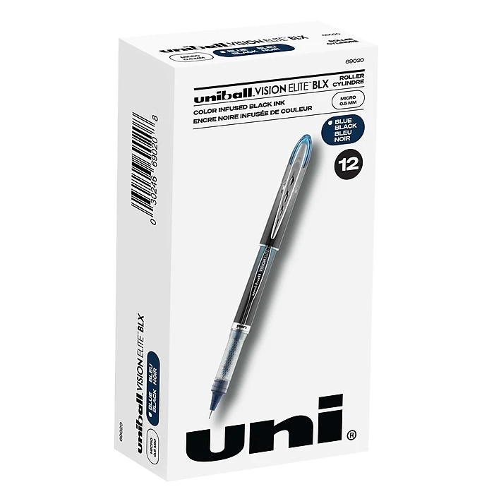 Enjoy a high-performance writing experience with these 0.8mm bold-point black-ink silver-barrel rollerball pens. The barrel is translucent, letting you keep an eye on the ink supply, while the black and white coloring gives the pen a stylish appearance. These uni-ball Vision Elite rollerball pens have a bold point to make whatever you write or draw stand out.