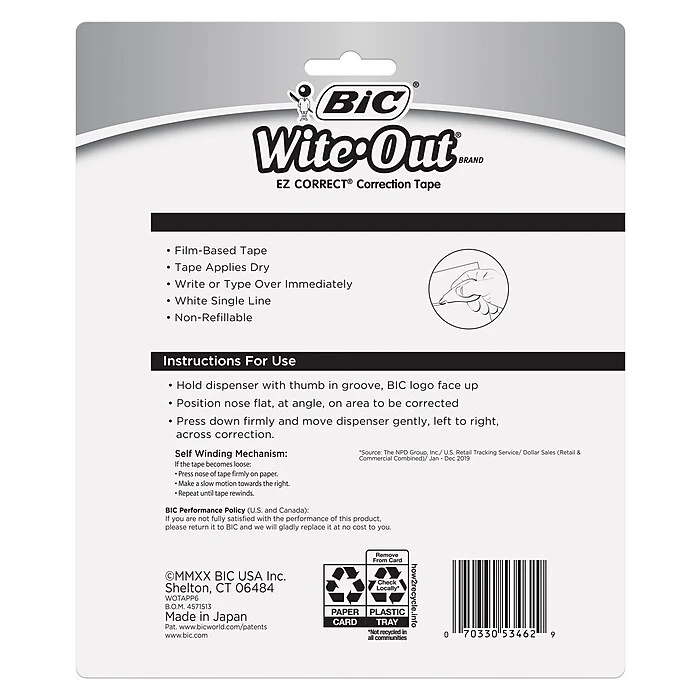 Fix mistakes fast with Wite-Out EZ Correct correction tape. Clean and easy-to-use, it applies dry, so you can write over immediately. The translucent dispenser provides visible tape supply.