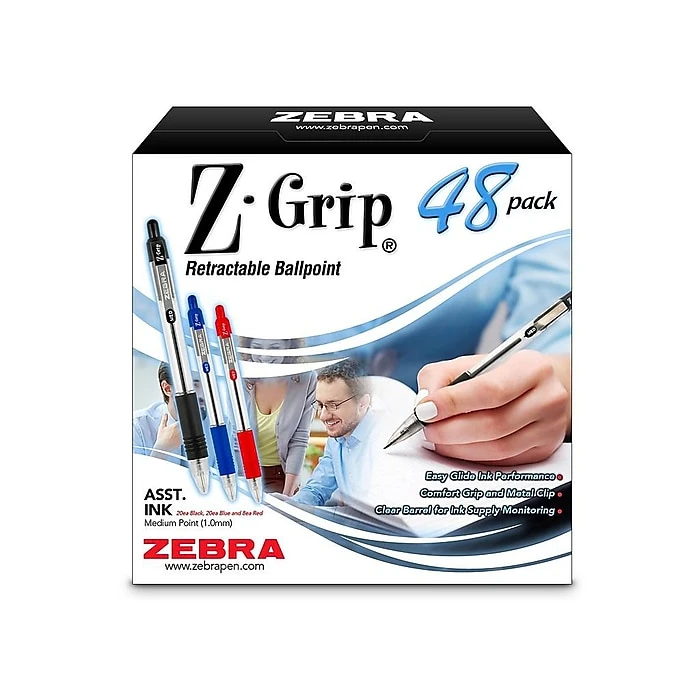 Enjoy smooth writing by using these 1.0mm medium-point assorted retractable ballpoint pens. The assorted colors make these pens ideal for color-coding projects or creating dynamic presentations, while the metal clips help you keep track of them. These Zebra Z-Grip assorted retractable ballpoint pens feature latex-free rubber grips to make writing long papers more comfortable.